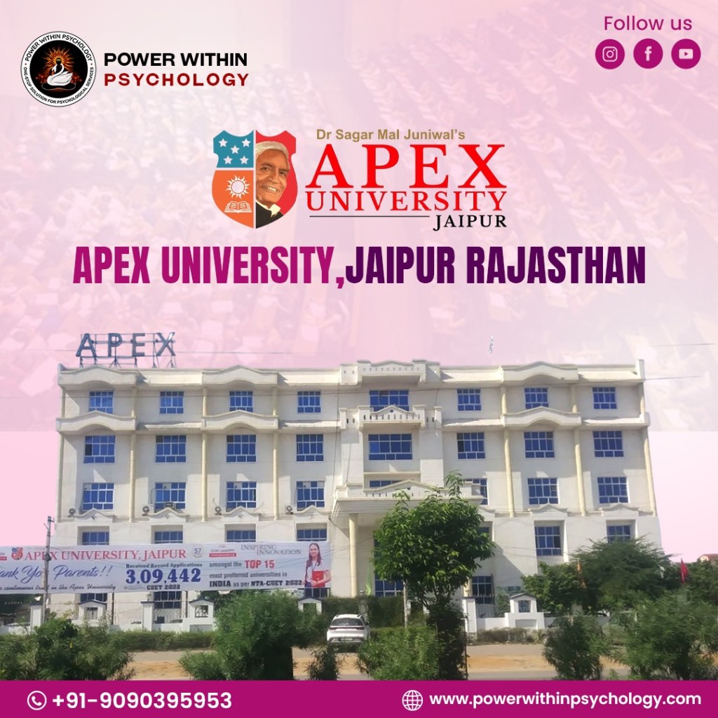 Apex University offers a structured and comprehensive pathway in the field of psychology, ranging from undergraduate to doctoral levels. With programs aligned to current academic and professional standards—including RCI-recognised courses—the university provides options for students at different stages of their academic journey. Admissions are available through CUET and AUCET and merit-based scholarships offer additional support for eligible candidates.