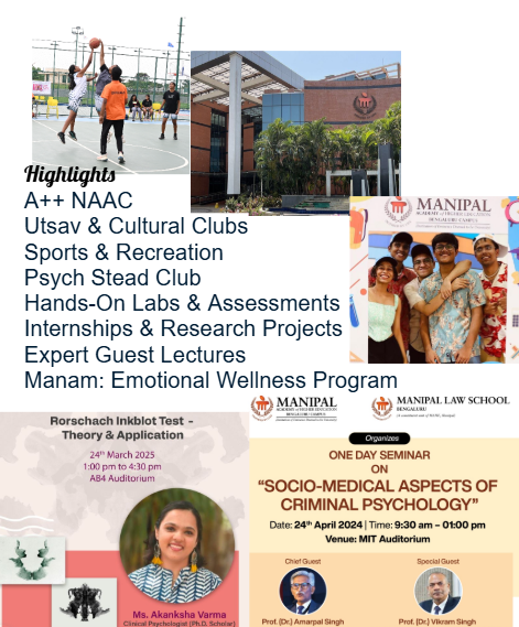 Psychology at MAHE is offered across multiple campuses under different departments. At Manipal University Jaipur, it comes under the School of Humanities and Social Sciences, offering BA and M.Sc. Clinical Psychology programs. At MCHP Manipal (Manipal College of Health Professions), the Department of Clinical Psychology provides RCI-recognized training focused on therapy and mental health. Sikkim Manipal University also offers psychology under its Faculty of Humanities & Social Sciences, with BA and PhD options. At MAHE Bengaluru, M.Sc. Applied Psychology is offered under the School of Liberal Arts, with specializations in Clinical, I/O, and Forensic Psychology.