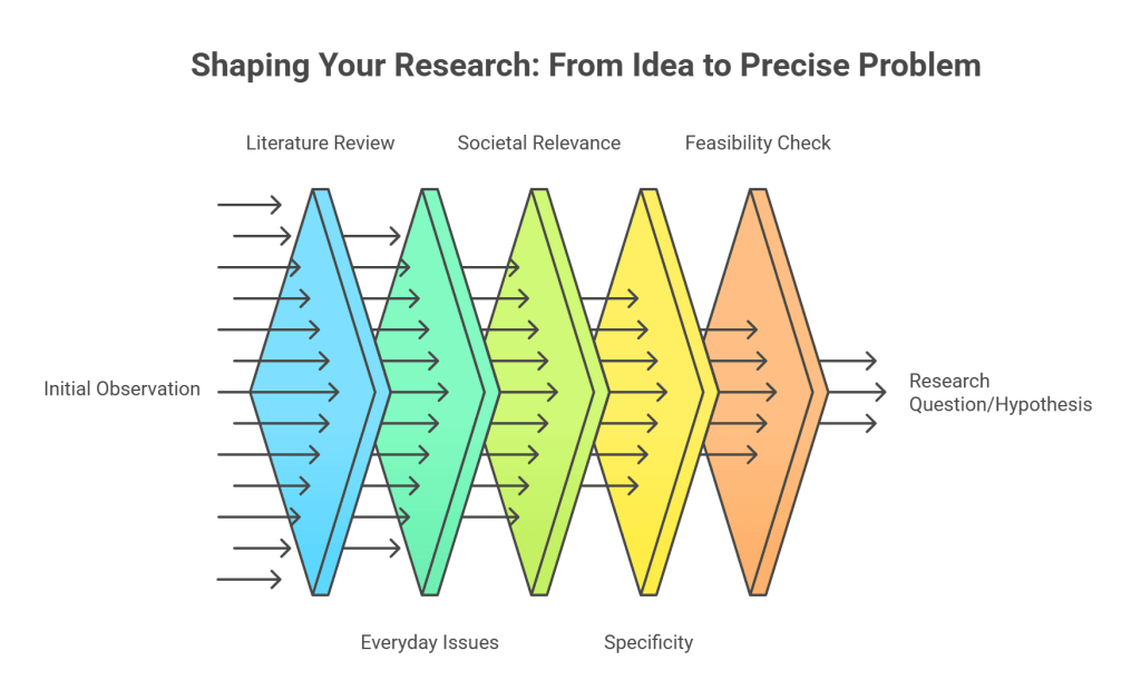“This illustration shows how scattered initial observations are gradually filtered through literature review, societal relevance, specificity, and feasibility checks, until they emerge as a focused research question or hypothesis.”