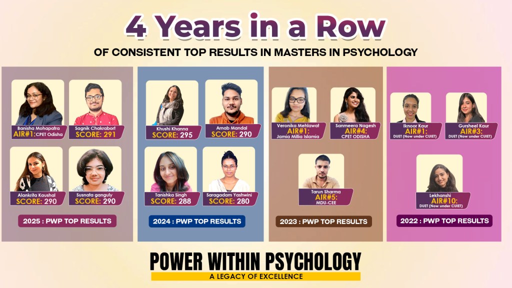 Power Within Psychology is India’s most trusted platform for Psychology entrance exam preparation. As an ISO 9001:2015 certified institution, we offer expert-led coaching, strategic resources, and authentic guidance for CUET PG, UGC NET JRF, GATE, MPhil/MA Clinical Psychology, PsyD, and more.