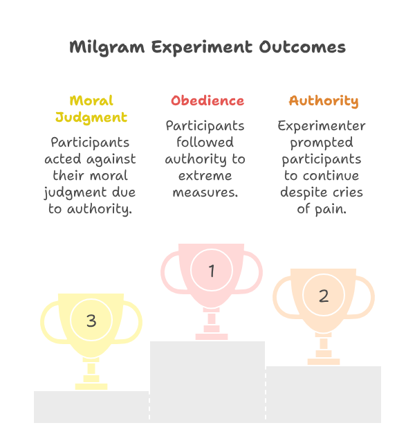 Setup: Participants were asked to administer electric shocks to a “learner” (actually an actor) whenever an answer was wrong.